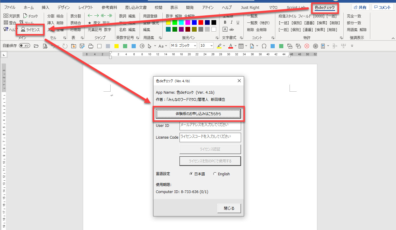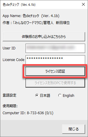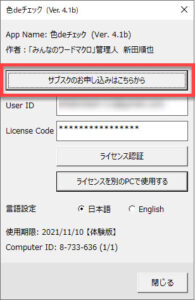 [色deチェック]タブの[ライセンス]ボタンからダイアログを起動します。