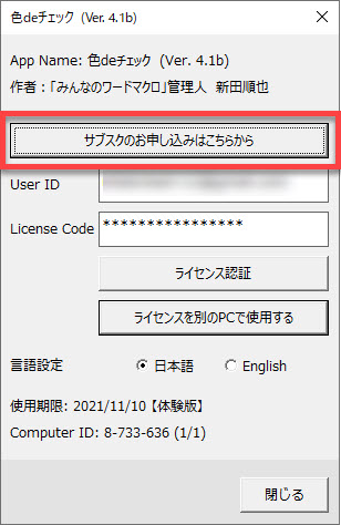 体験版の試用期間の後も継続して色deチェックをご利用いただける場合には、[サブスクのお申し込みはこちら]ボタンをクリックしてお申し込みください。