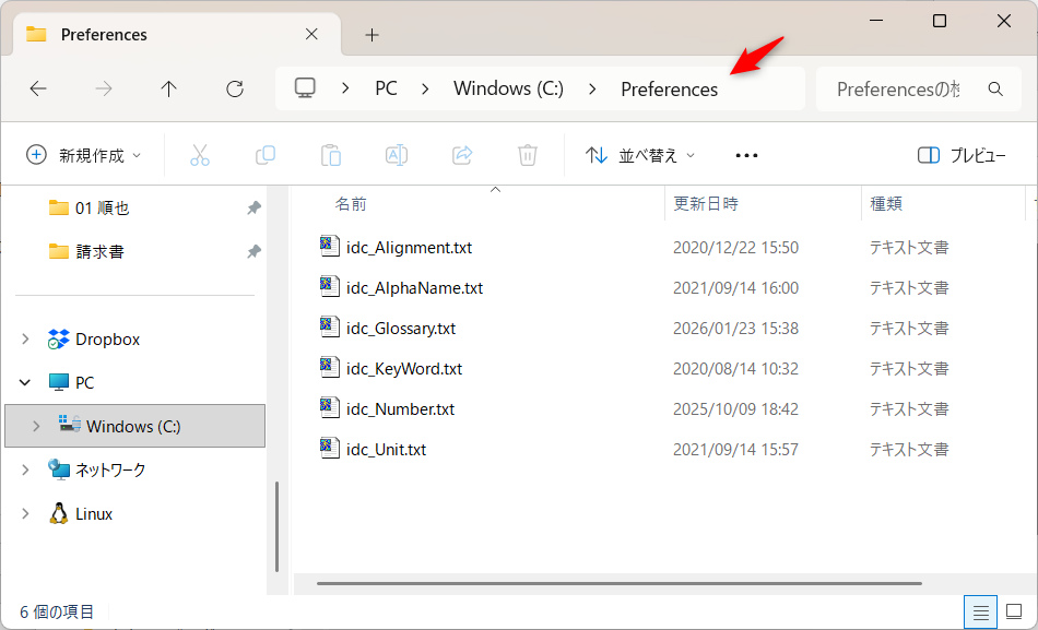 [Preferences]フォルダを丸ごとコピーして、別の場所に貼り付けてもよいでしょう。たとえば、以下のようにCドライブの直下に[Preferences]フォルダを保存します。