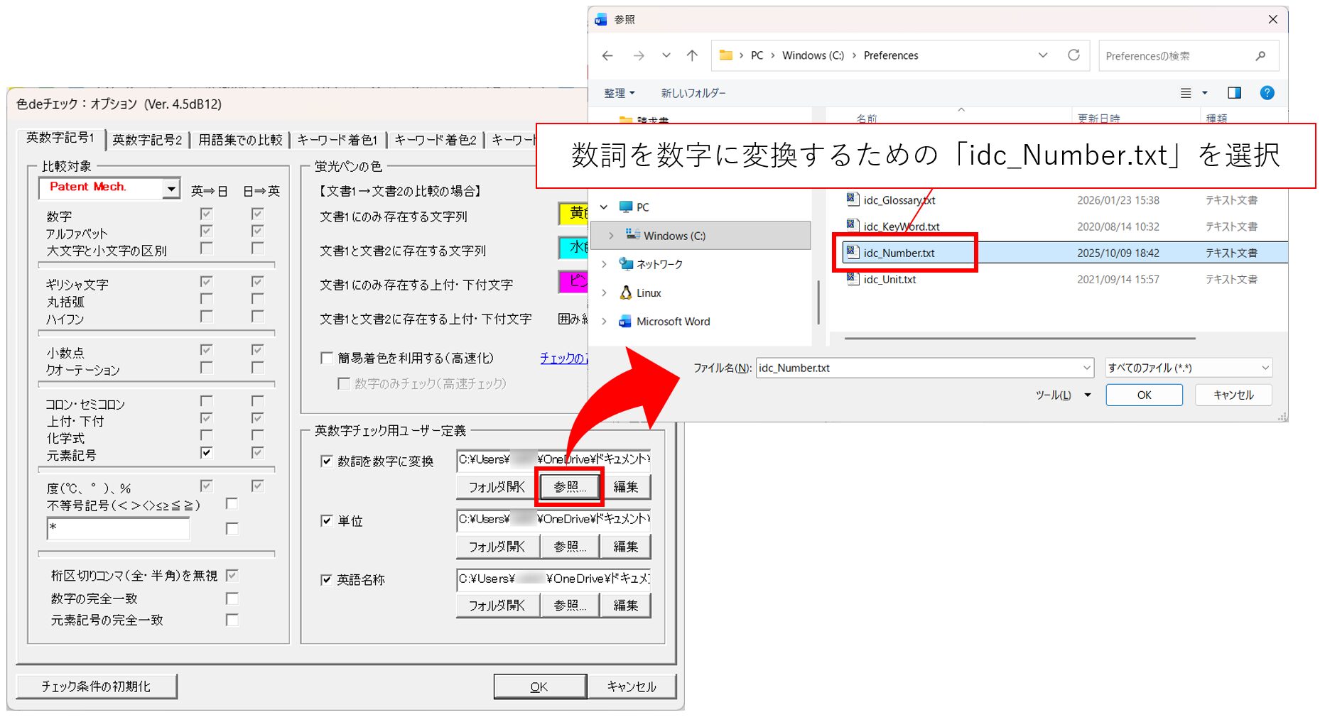 この後、上記のファイルの設定で説明したダイアログの[参照]ボタンをクリックして、それぞれの対応するファイルを選択して設定します。以下の例では、「数詞を数字に変換」の項目のユーザー定義ファイルに該当する「idc_Number.txt」を選択しいます。