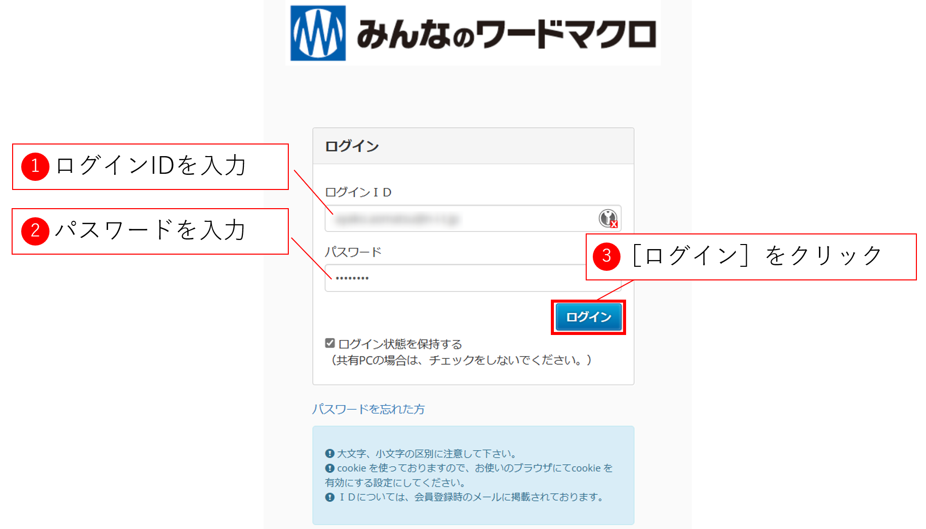 なお、みんなのワードマクロのアドインをご利用でない場合やセミナーを受講したことがない場合には、正しいログインIDとパスワードを使ってもログインできないことがあります。