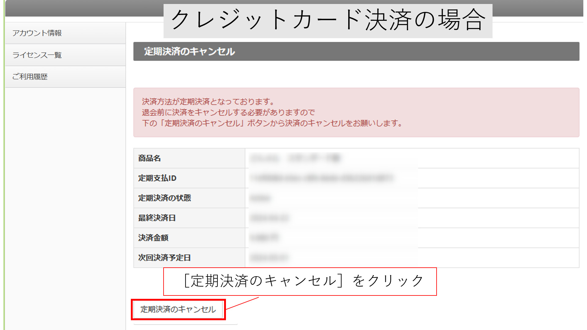 [定期決済のキャンセル]ボタンをクリックしてキャンセルします。