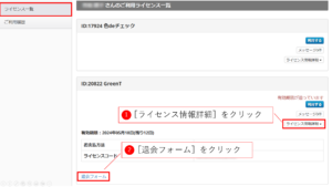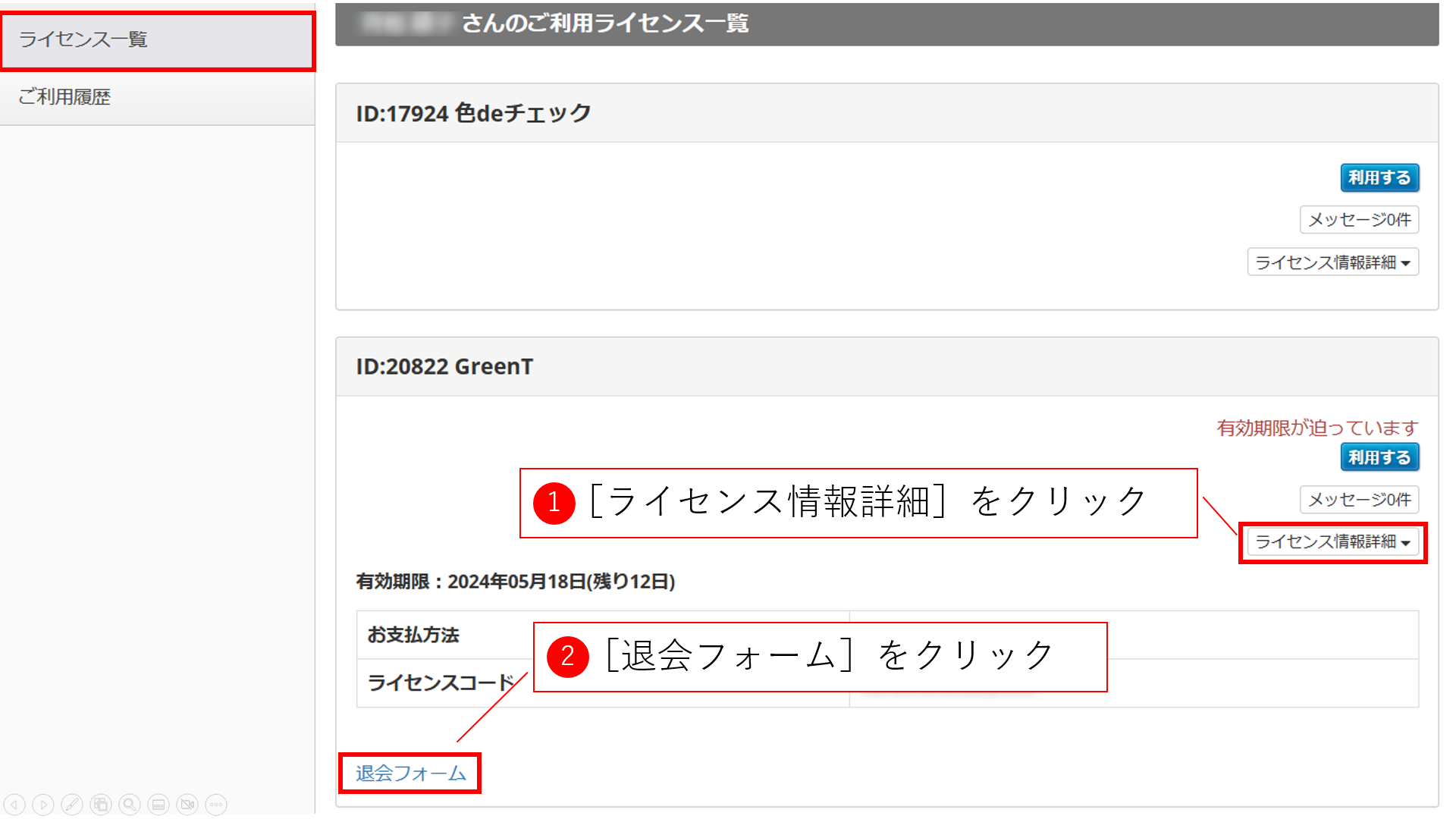2.[ライセンス一覧]でライセンスの[退会フォーム]を表示