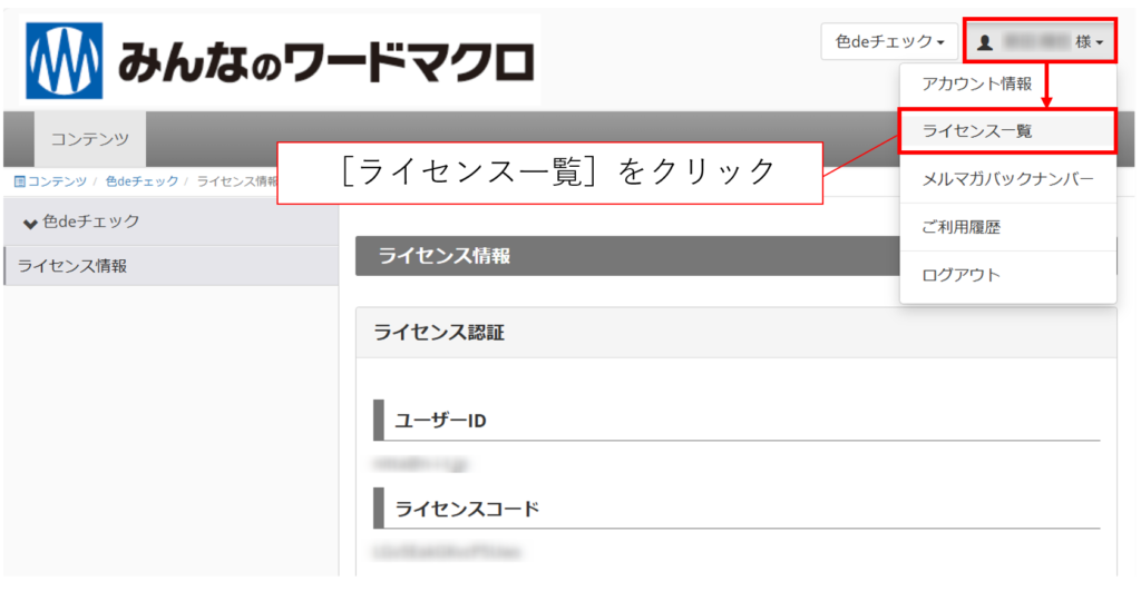 サイトにログインしたら、右上のメニューから[ライセンス一覧]を選択します。