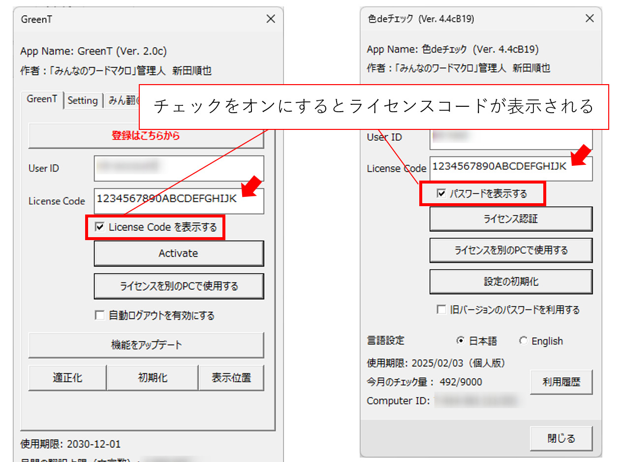 すでにライセンスコードを取得しておりWordアドインに登録してある場合には、認証用のダイアログを開き、以下のチェックボックスをオンにすればライセンスコードを表示できます。
