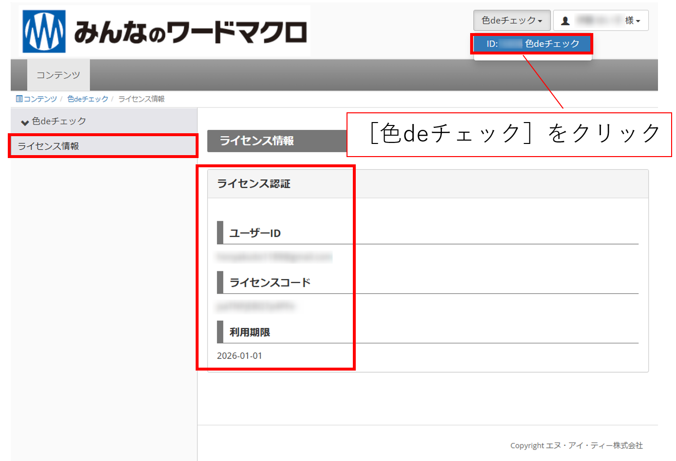 すると、色deチェックのページが開き、[ライセンス情報]のページに、ユーザーID、ライセンスコード、利用期限が表示されます。