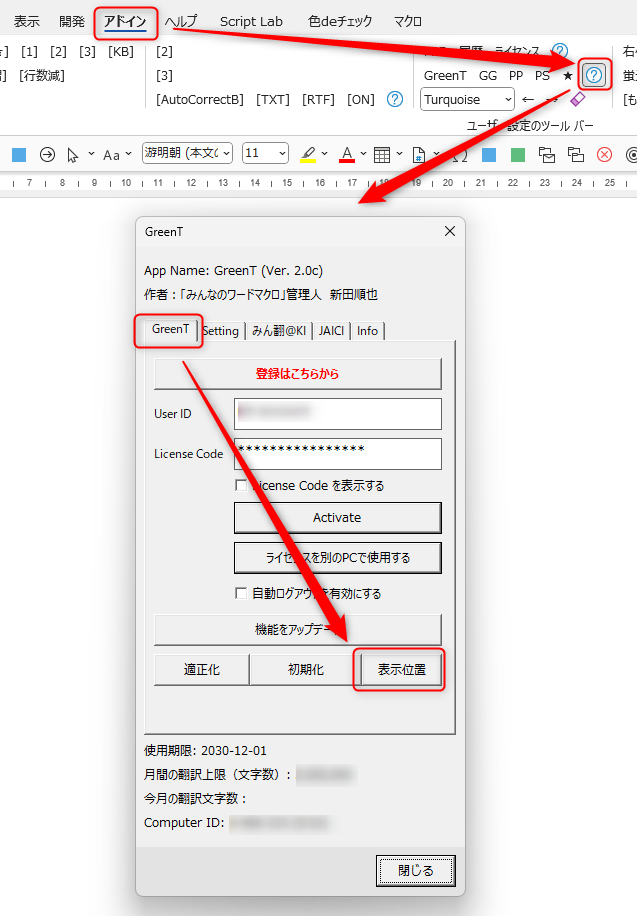 [アドイン]タブの[?]ボタンをクリックして[ヘルプ]ダイアログを開くと、以下の部分に[表示位置]ボタンがあります。このボタンをクリックしてください。