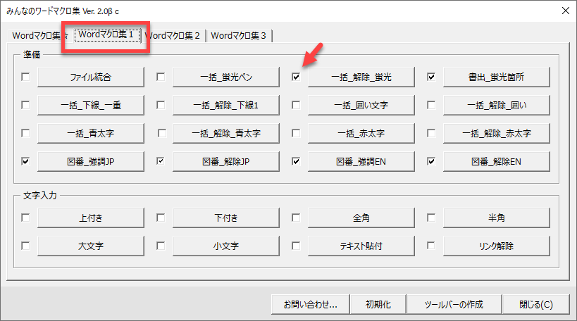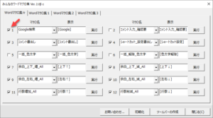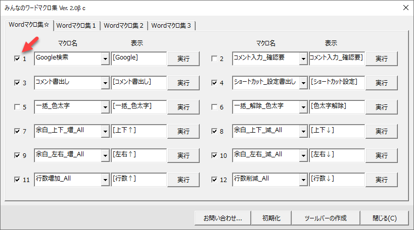 [Wordマクロ集1]~[Wordマクロ集3]タブではマクロ名と順序が決まっています。そのため、作成するマクロにチェックを入れるだけでボタンを作成できます。
