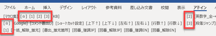 [Wordマクロ集☆]タブのマクロはお好みの順序でお好みのボタン名で12個まで[☆]のグループに登録できます。[Wordマクロ集1]~[Wordマクロ集3]のマクロは、すでに決められた順序とボタン名で[1]、[2]、[3]のグループに登録します。
