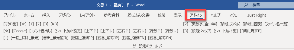 しかし、マクロを実行するたびにこのダイアログボックスを開くのは面倒ですから、よく使うマクロのボタンを作成します。ツールバーやアドインタブに以下のようにマクロ実行用のボタンが表示されます。