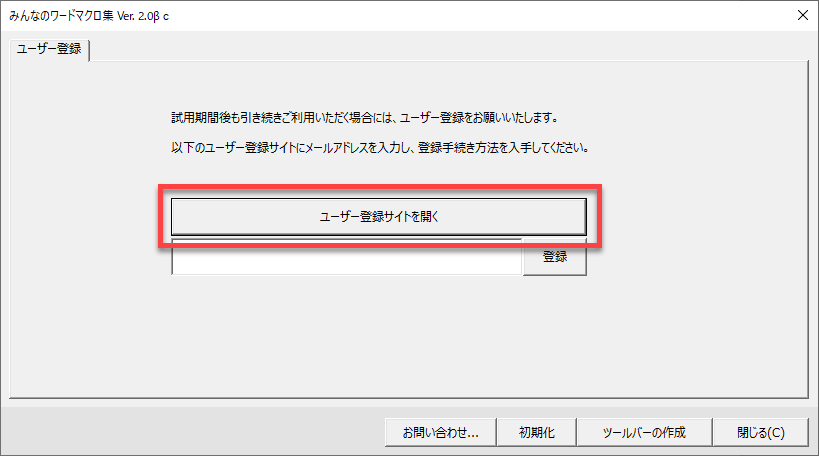 継続してご利用をいただける場合には、[ユーザー登録サイトを開く]ボタンをクリックして登録サイトを開き、正規版のパスワードをご購入ください。