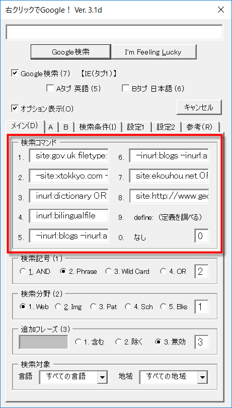 サイトを指定する「site:」コマンドや、URLの文字列を指定する「inurl:」コマンドなど、よく使うコマンドを登録しておけばすぐに呼び出して入力できます。