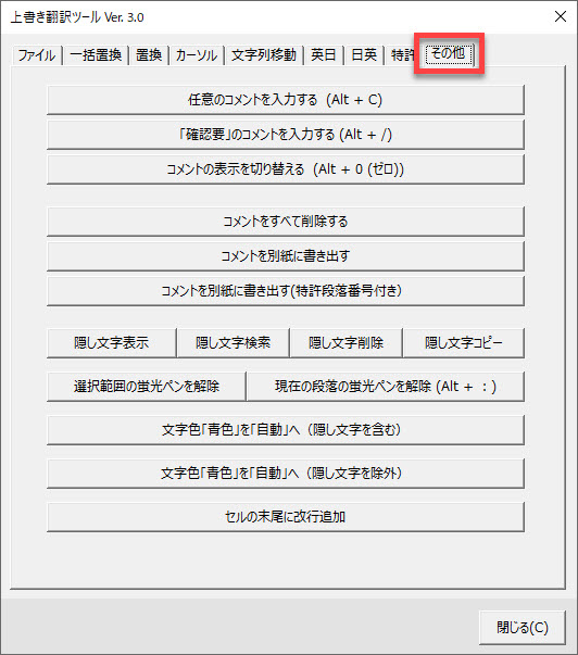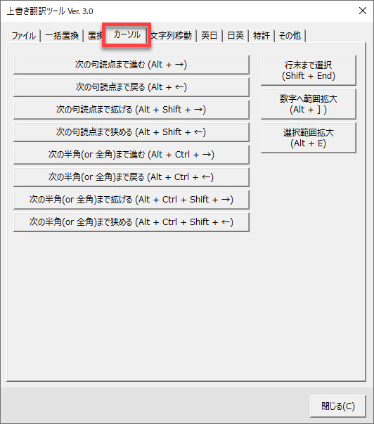 上書き翻訳に欠かせない文字列の選択やカーソルの移動の自動化など、便利な機能が揃っています。もちろんすべてショートカットキーで実行できます。