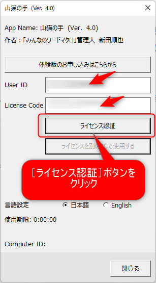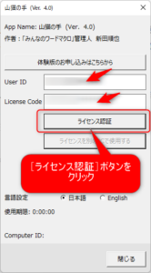 ユーザーID(登録したメールアドレス)と取得したライセンスコードをライセンス登録用のダイアログに入力して[ライセンス認証]ボタンをクリックしてライセンス認証をします。