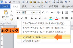 (1)リボンにカーソルを置いて右クリックをして、「リボンのユーザー設定」を選択します。