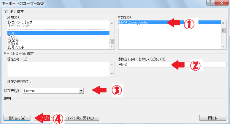 ②「割り当てるキーを押してください(N)」欄を選択し、キーを押します。例として[Alt] + [Z]で登録しています。