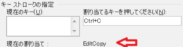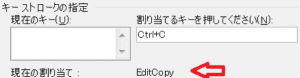 注:すでに用いられているキーを登録しようとすると下図のように、現在の割り当てに操作対象となっている項目が表示されます(EditCopyは、コピーを意味します。[Ctrl] + [C]の組み合わせを登録しようとしています)。