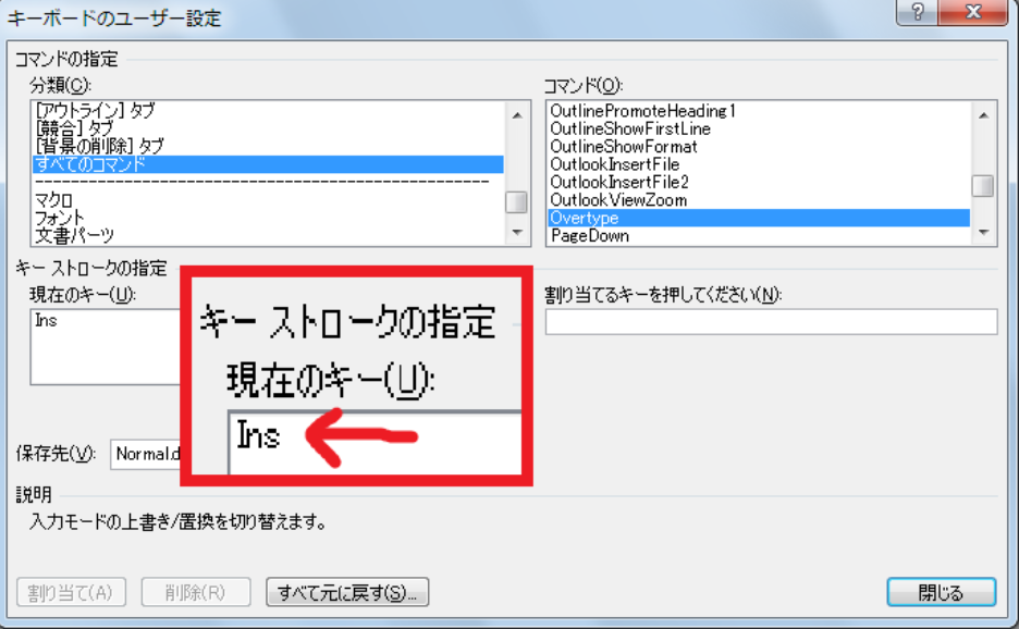 これで、[Insert] キーに割り付けられた「Overtype」のコマンドを解除しました。