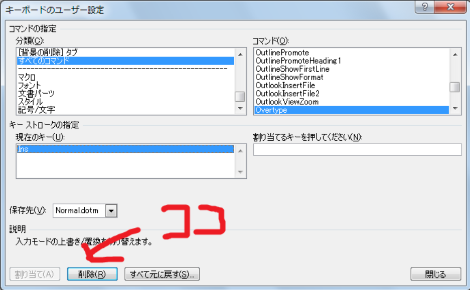 現在、「Overtype」というコマンドが[Insert]キーから呼び出されますが、この設定を削除します。