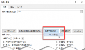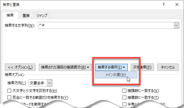[検索する場所]ドロップダウンリストから[メイン文書]を選択すると、対象箇所が選択されます。