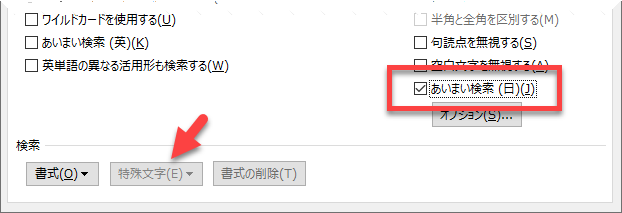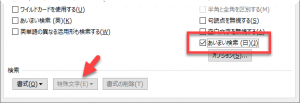 たとえば、[あいまい検索(日)]がオンになっていると特殊文字を使えないので、このボタンがグレーアウトされてしまってクリックできません。ご注意ください。