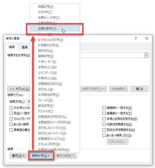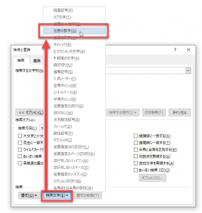 [検索する文字列]欄にカーソルを置いて、[特殊文字]ボタンをクリックすると、使える特殊文字のリストが表示されます。