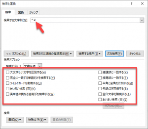 このとき、[検索する文字列]欄に^#を入力します。オプション設定をオフにすることをお忘れなく。