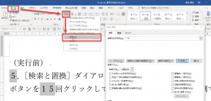 「【Word】[検索と置換]ダイアログボックスにて複数箇所の文字列を選択する 」で紹介したとおり、[検索と置換]ダイアログボックスを設定してみます。