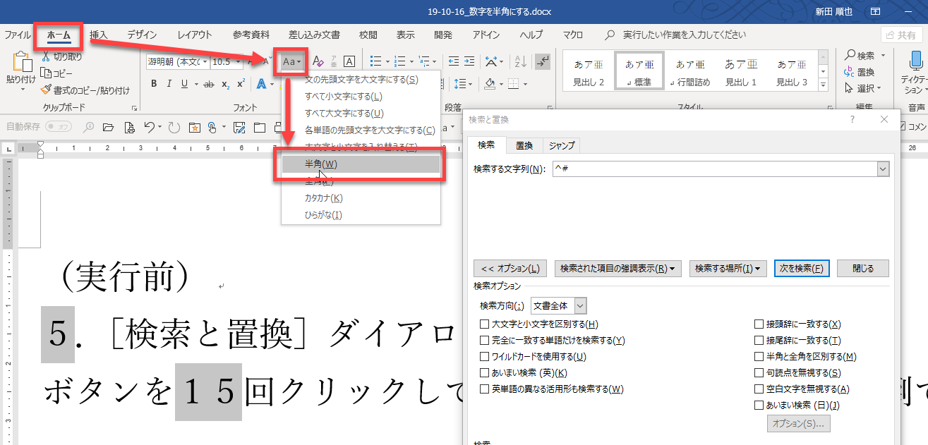 ということは、[検索と置換]ダイアログボックスで全角数字を検索できるのであれば、それを同時に選択して半角に変換すればいいということですね。