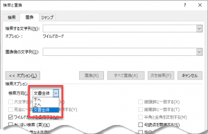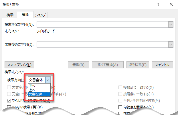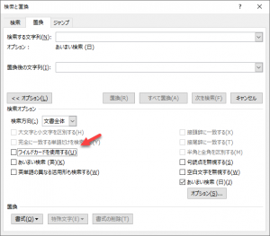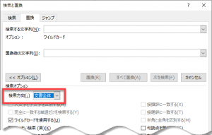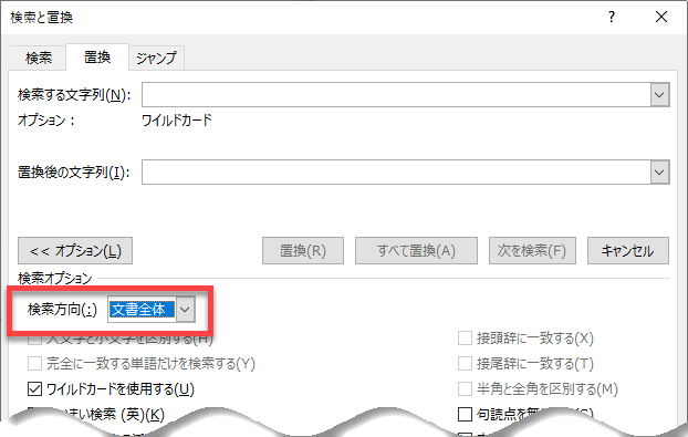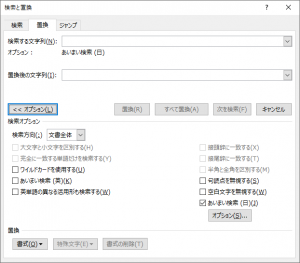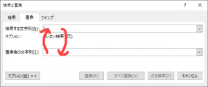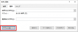 [検索と置換]ダイアログボックスでは、[置換後の文字列]欄にカーソル(フォーカス)があるときに[Tab]キーを押すと、以下のように[オプション]ボタンにフォーカスが移動します。