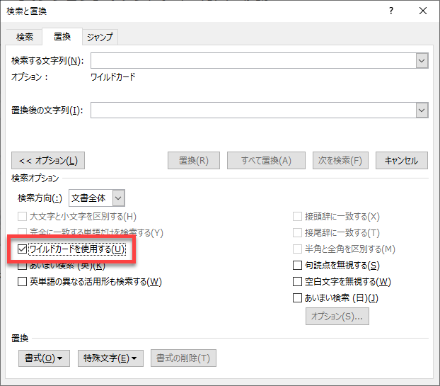 以下の場合、[ワイルドカードを使用する]にフォーカスがあります。
