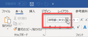 たとえば、フォント名を変更するドロップダウンリストをクイックアクセスツールバーに追加する場合、以下のようにドロップダウンリストの矢印位置にマウスを合わせます。