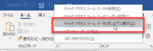 移動の仕方は簡単です。やっぱり右クリックでです。クイックアクセスツールバーで右クリックをしたときに表示される[クイックアクセスツールバーをリボンの下に表示]メニューをクリックします。