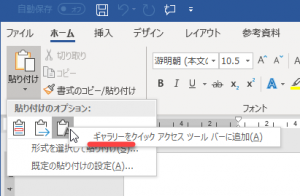 たとえば、「テキストのみ保持して貼り付け」機能をクイックアクセスツールバーに追加したいと思って以下のように右クリックをすると、[ギャラリーをクイックアクセスツールバーに追加]というメニューが表示されます。
