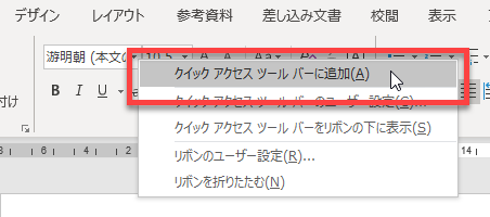 この辺りで右クリックをすると、[クイックアクセスツールバーに追加]メニューが表示されるのでそれをクリックします。