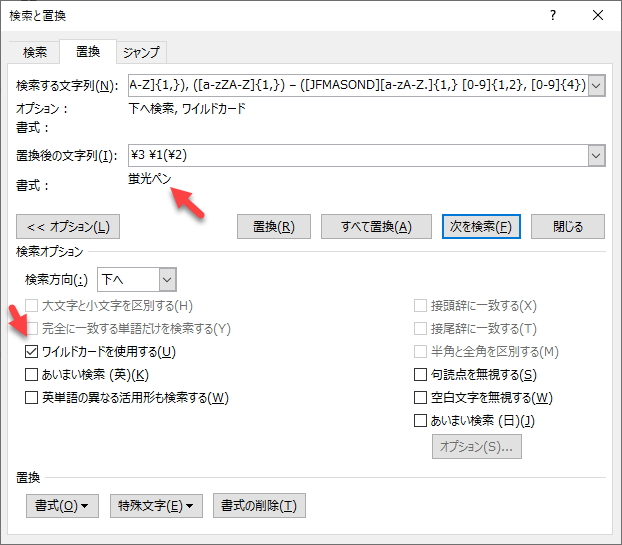 ワイルドカードをオンにしてください。あと、置換後の文字列に蛍光ペンを設定しておくと、一括置換をした場合でも安心ですね。