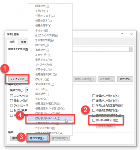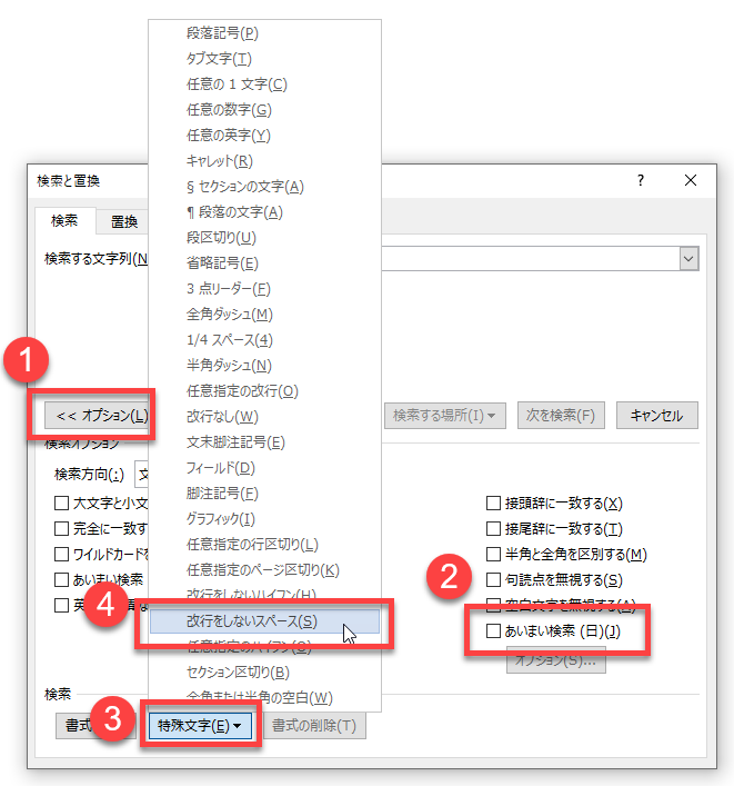 [あいまい検索]をオフにすると[特殊文字]メニューをクリックできるようになります。ここで[改行をしないスペース]を選択します。