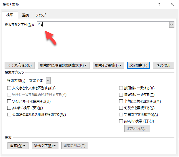 すると、[検索する文字列]欄に ^s が入力されます。そうです。これが「改行をしないスペース」を検索するための特殊文字なのです。