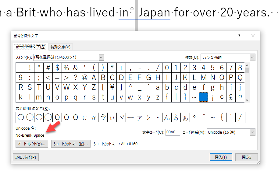 そうです。ここで赤矢印に表示される「No-Break Space」という名称に出会います。