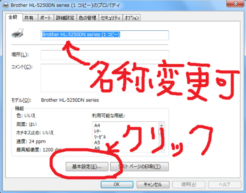また、印刷時のプロパティダイアログボックスを、「基本設定」ボタンをクリックして開くことが出来ます。
