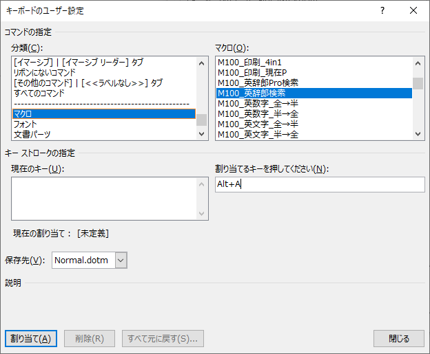 たとえば、「英辞郎 on the Web で辞書検索するWordマクロ」を実行するためのショートカットキーを英辞郎の「エイ」にちなんで[A]キーで実行しようと決めました。