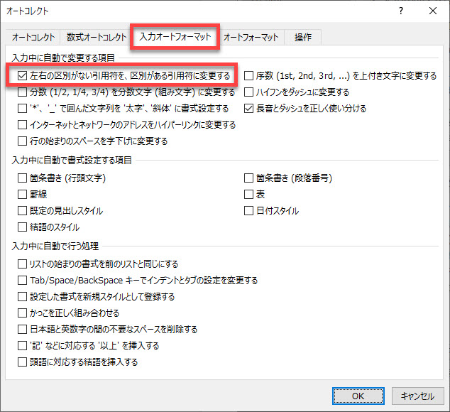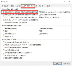 [Alt]+[A]のショートカットキーでオートコレクトのダイアログを開き、以下の項目をオフにします。