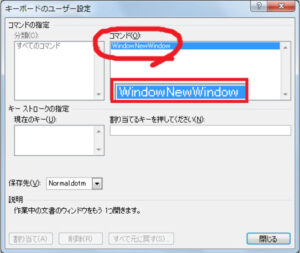 すると、「新しいウィンドウを開く」に対応するコマンド名が表示された状態で、「キーボードのユーザー設定」ダイアログが開きます!