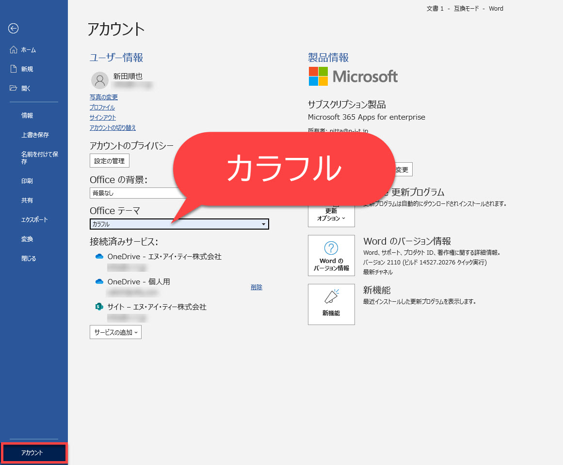 ここで、[アカウント]をクリックしてアカウントページを表示します。以下のOfficeテーマのプルダウンメニューから「カラフル」を選択します。これで設定完了です。
