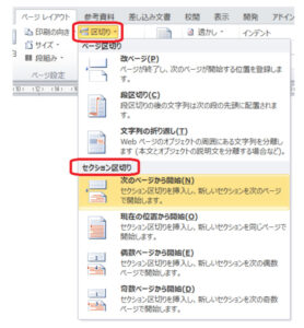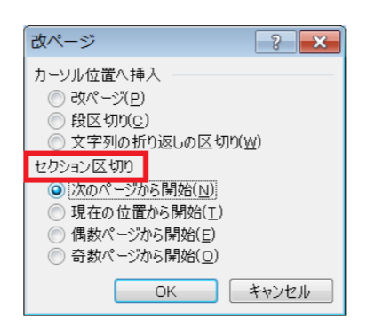 「改ページ」ダイアログボックスでは、セクション区切りの項目がありますので、選択します。