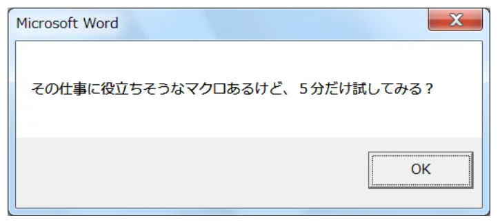 MsgBox "その仕事に役立ちそうなマクロあるけど、5分だけ試してみる?"