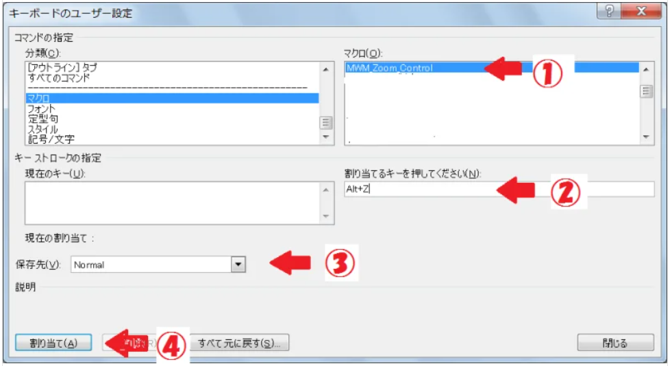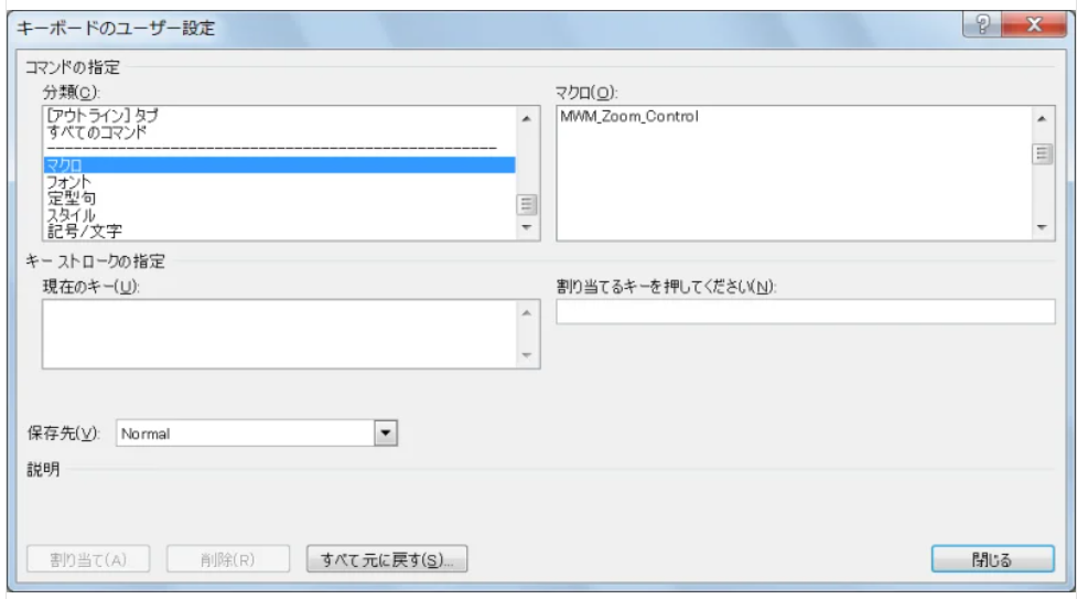 どのマクロにおいても、同様の操作にてキーボードへの割り付けができます。