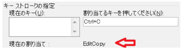 すでに用いられているキーを登録しようとすると下図のように、現在の割り当てに操作対象となっている項目が表示されます。使われていないキーを選択し直してください。