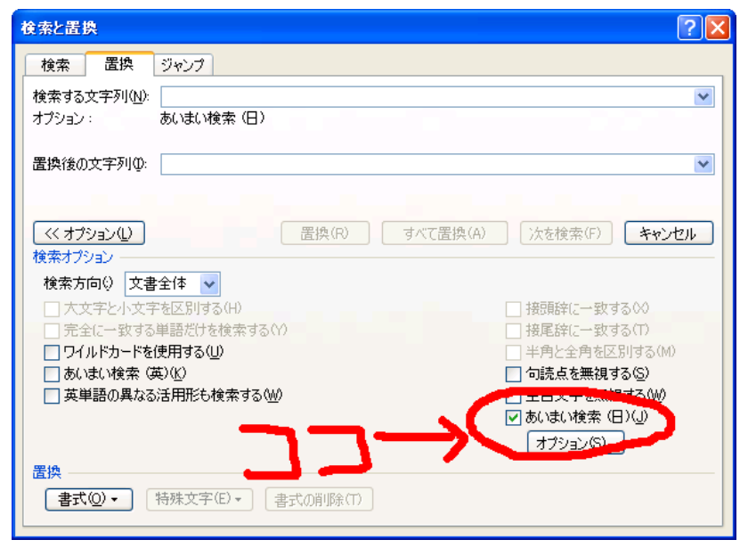 たとえば、検索と置換ダイアログボックスでは、以下のようにワイルドカード検索とあいまい検索(日)を同時に選択することはできませんね。