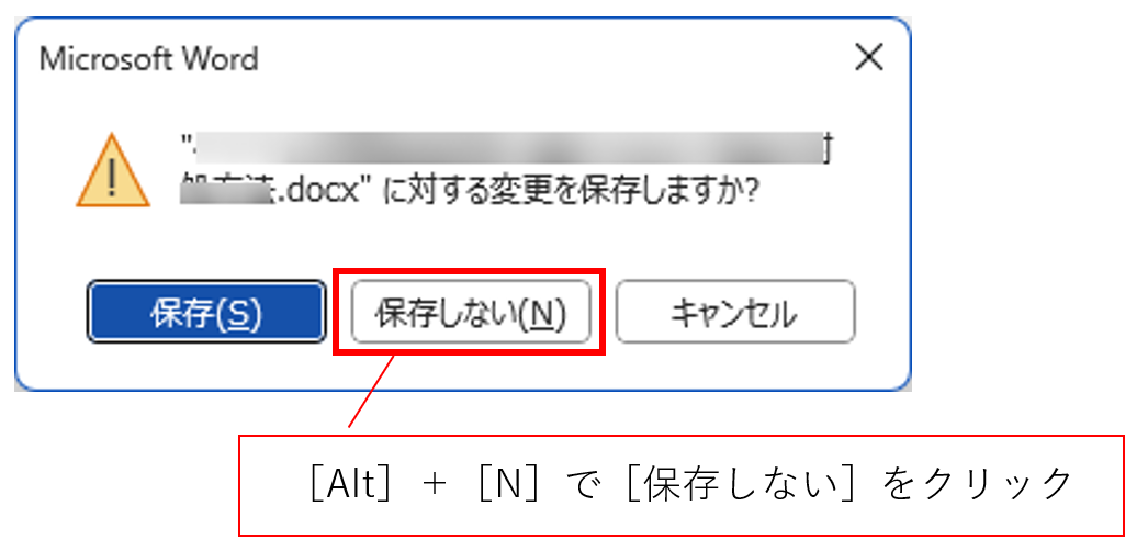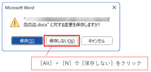 [Ctrl]+[W]のショートカットキーでテストファイルを閉じる場合にも間違って保存しないように気を付けています。「・・・に対する変更を保存しますか?」のダイアログが表示されるとき、[Alt]+[N]のショートカットキーで[保存しない]ボタンをクリックしてファイルを閉じれば、テストファイルを改変することなく閉じられます。
